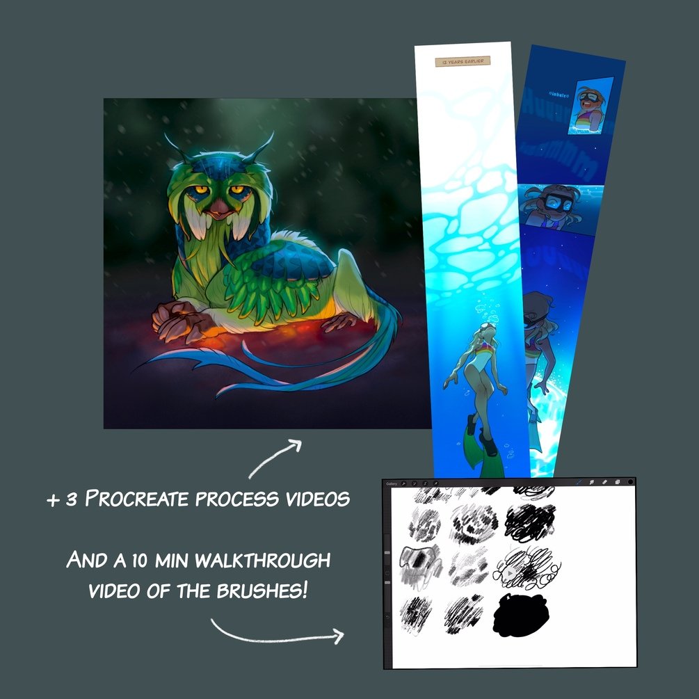 Included in the download is a 10min video of me going through the brushes, 3 example procreate videos with artwork where I used these brushes and a screenshot of my pressure sensitivity settings (to avoid hand strain and injury). This pack has a total of 11 pencil brushes, 2 gradient brushes and 1 colour block brush.